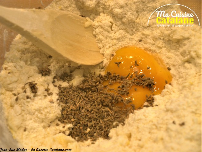 Creuser un puits, incorporer jaunes d’œufs, lait, grains d’anis Pétrir la pâte jusqu’à ce qu’elle soit homogène.
